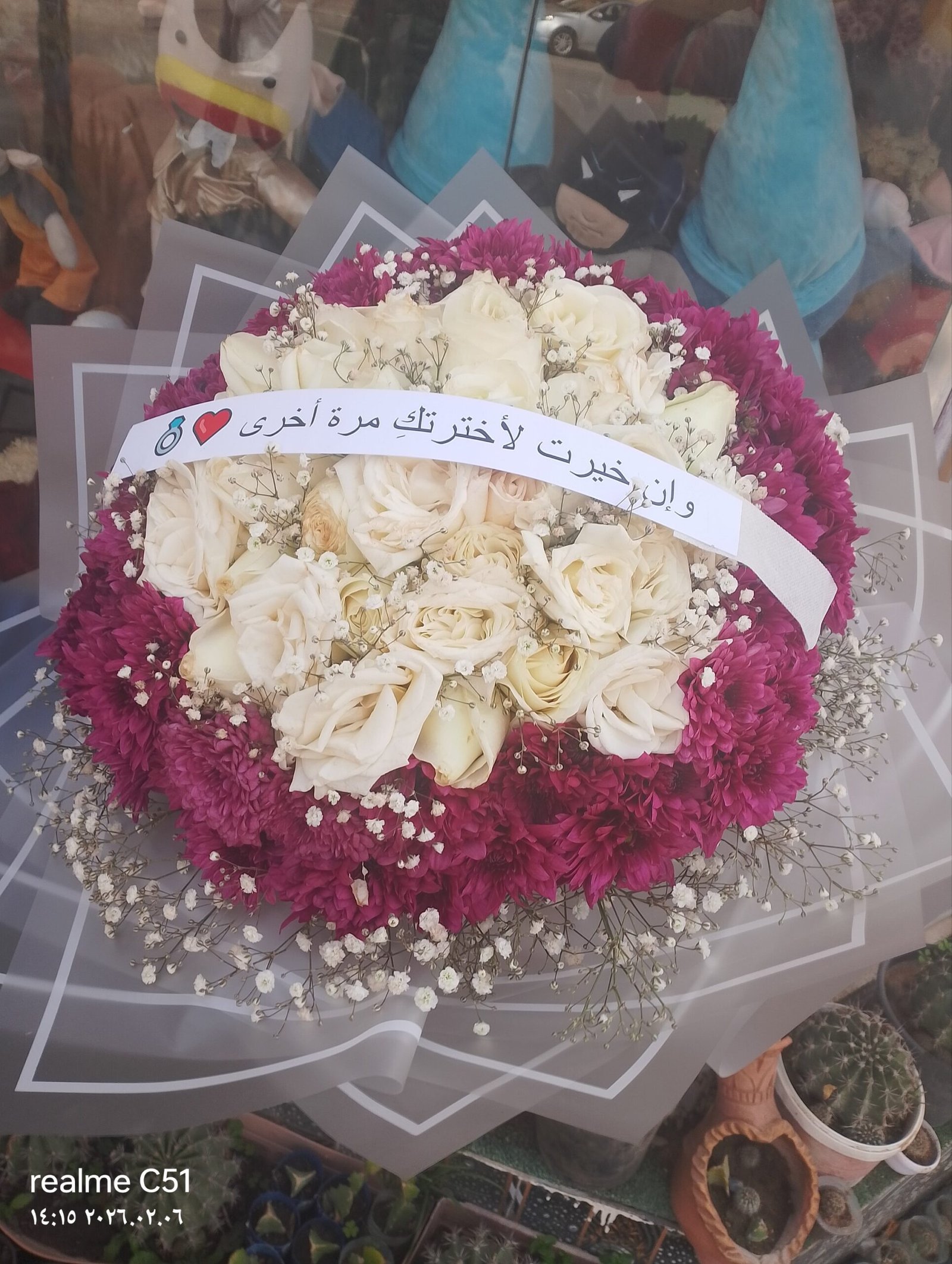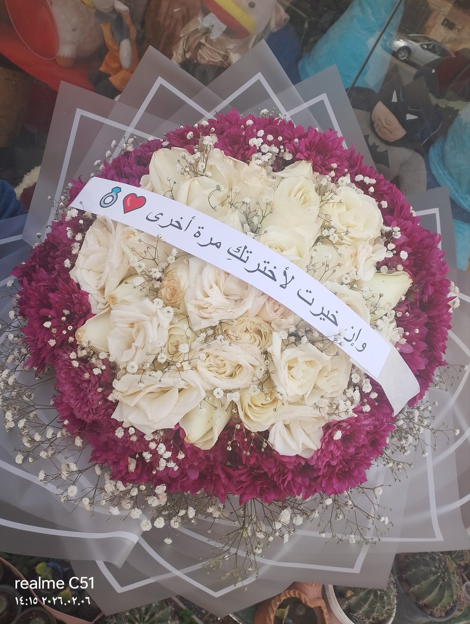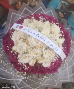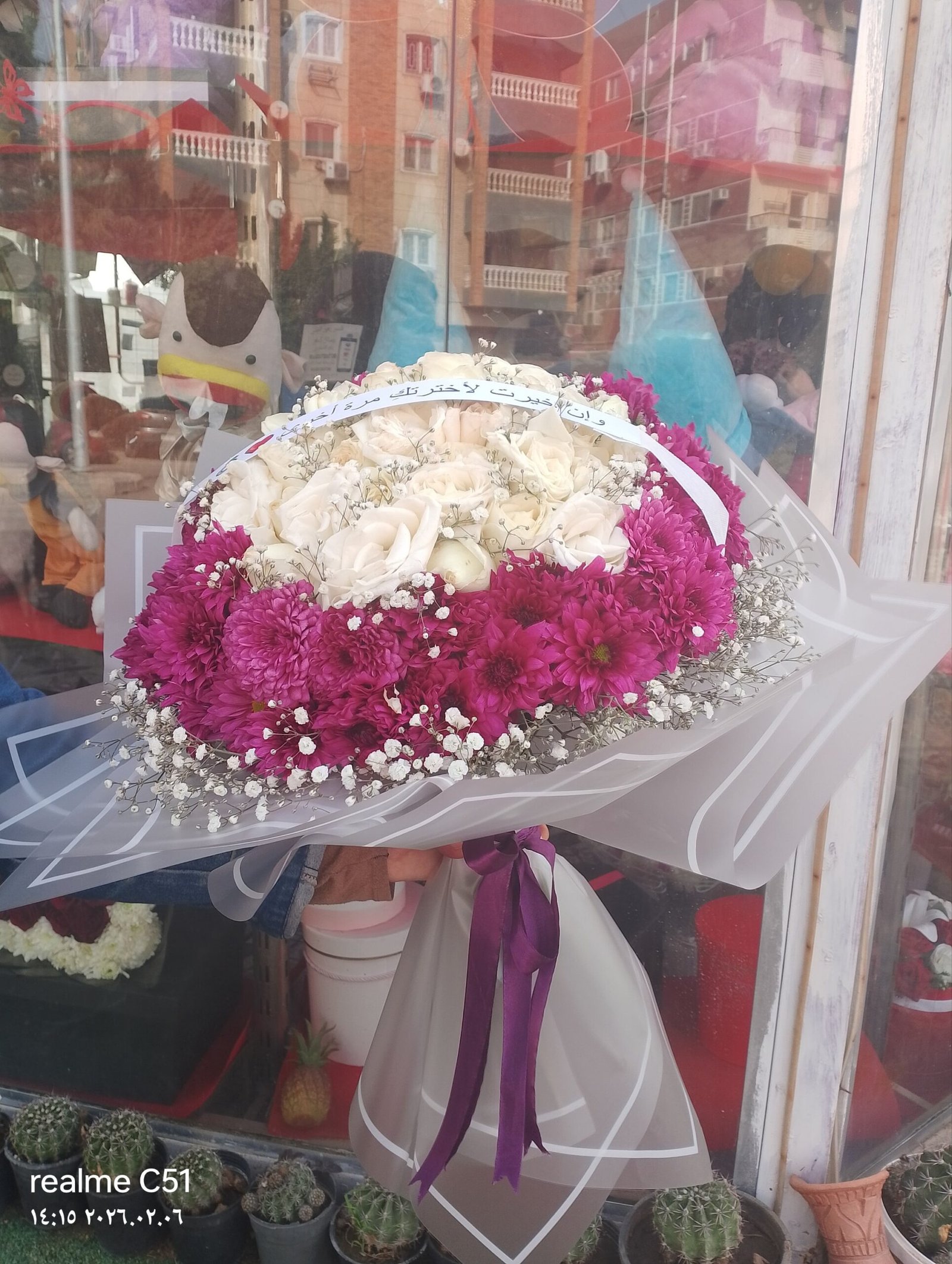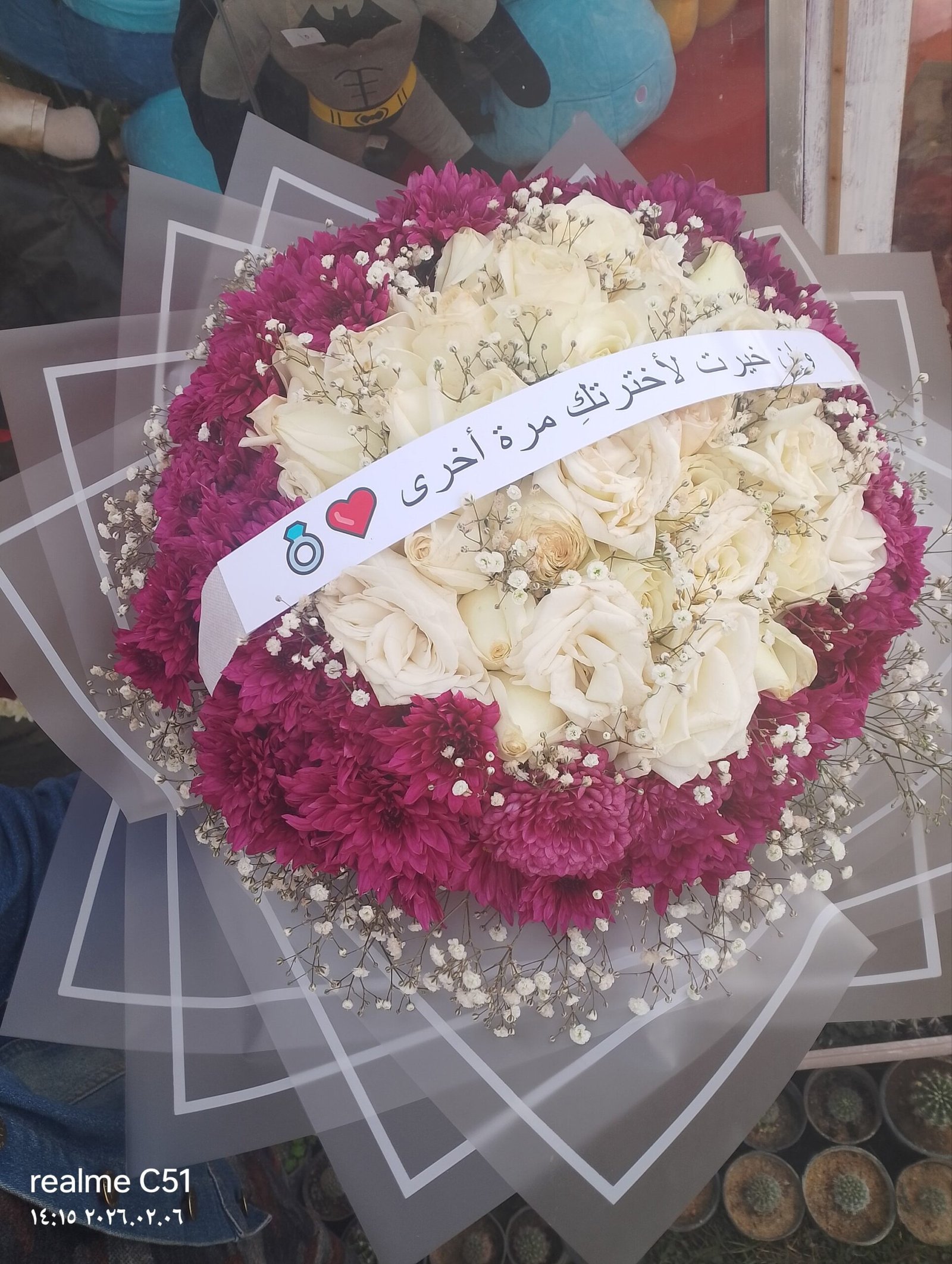 40 white roses, 60 dark purple chrysanthemum sticks, imported packaging, greeting ribbon
