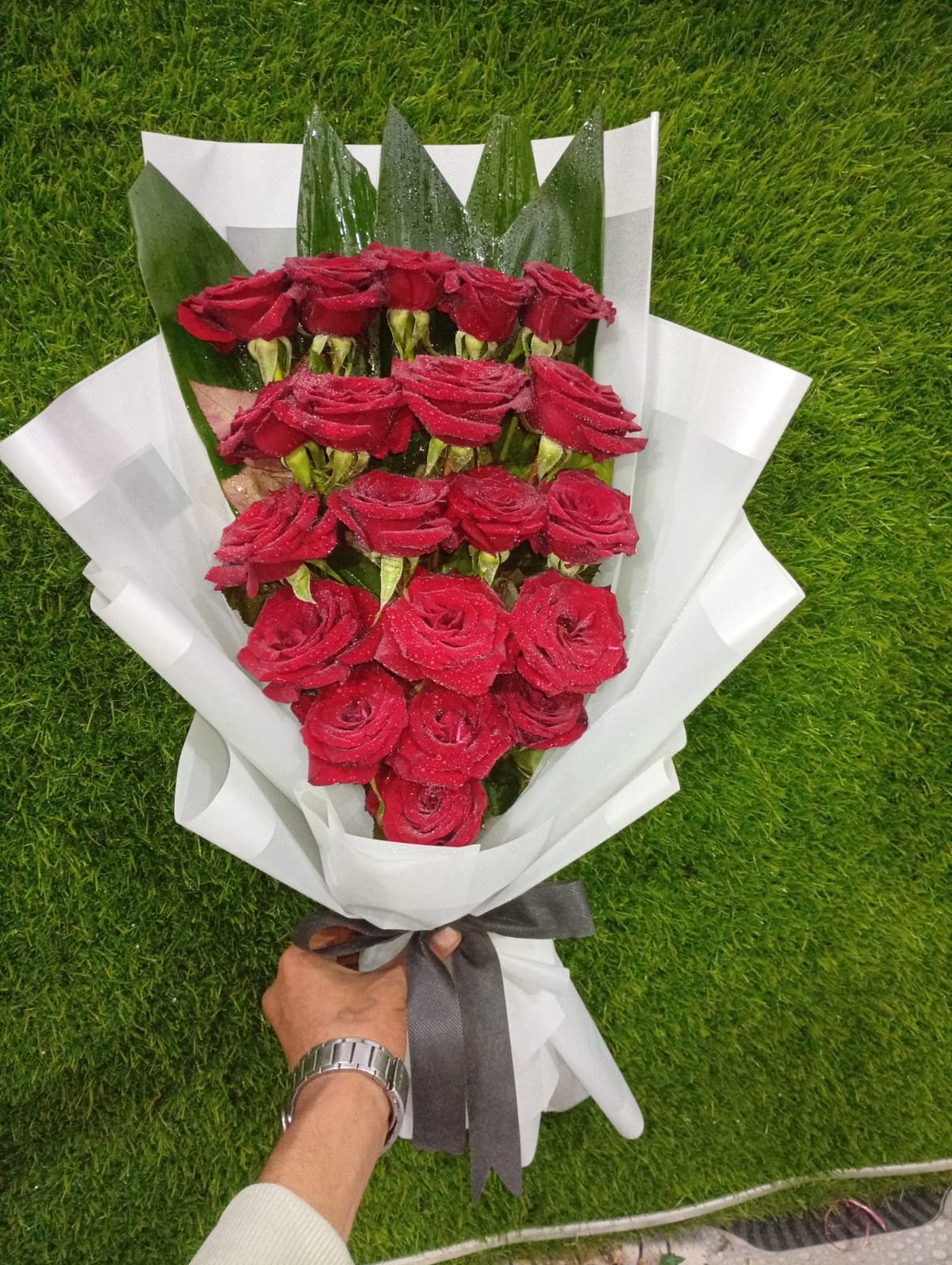 Surprise someone special with 20 fresh red roses elegantly wrapped in 4 imported gray wrappings – ideal for anniversaries, Valentine’s Day, or any special occasion.