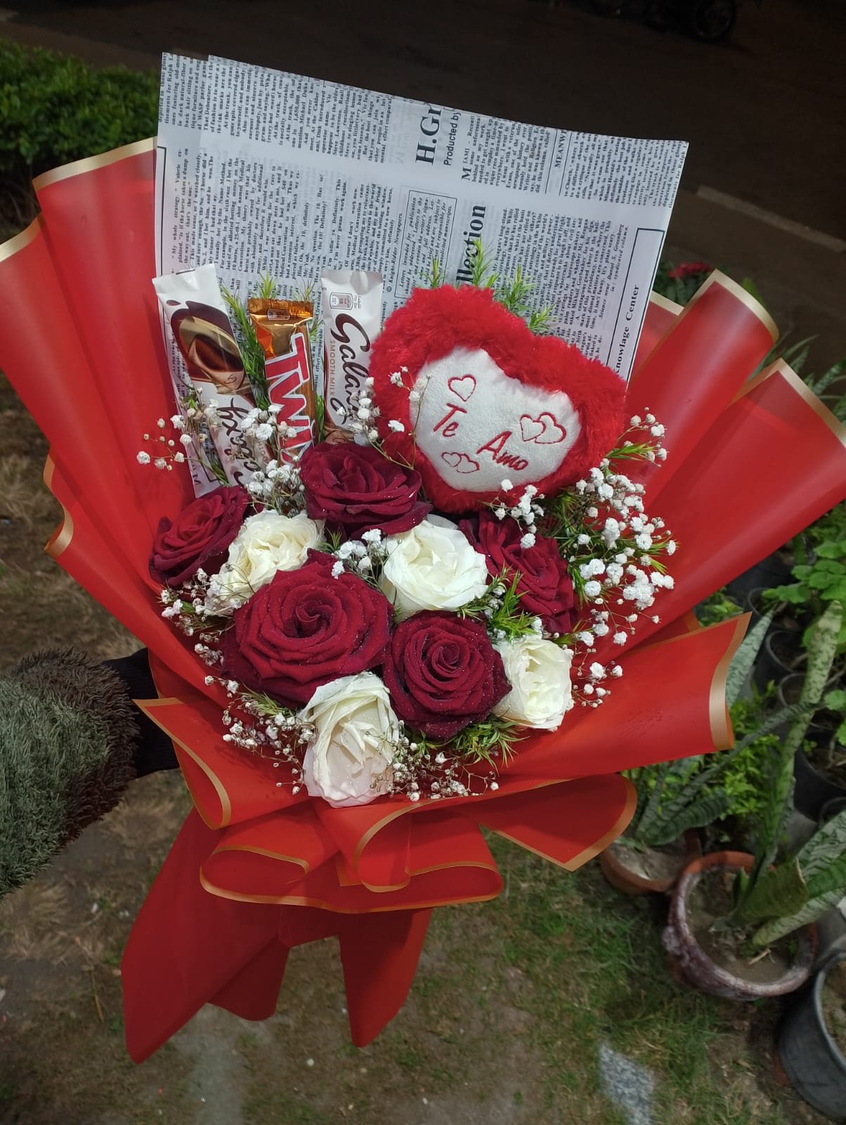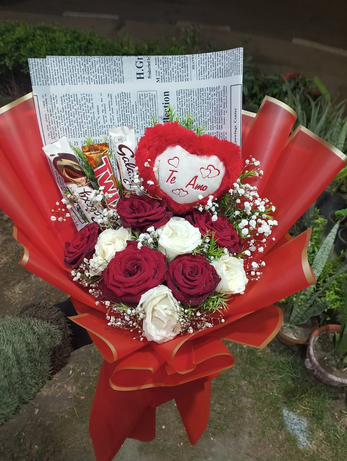 This romantic gift set includes 9 super-quality red and white roses arranged with delicate baby flowers and a charming small heart accent. Finished with luxurious imported wrapping and complemented by 3 delicious chocolate pieces, this bouquet is ideal for birthdays, anniversaries, Valentine’s Day, or expressing love in a thoughtful and elegant way.